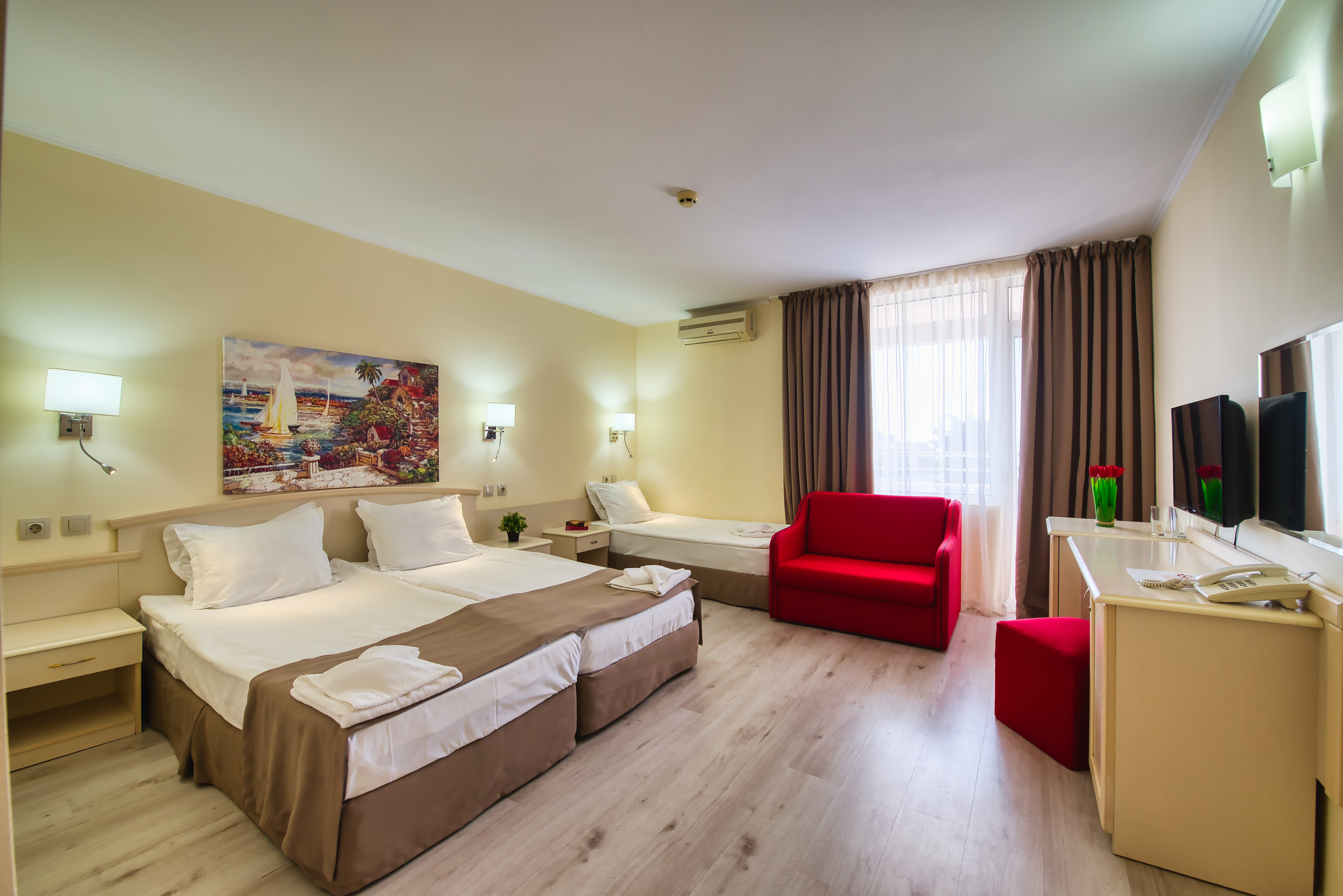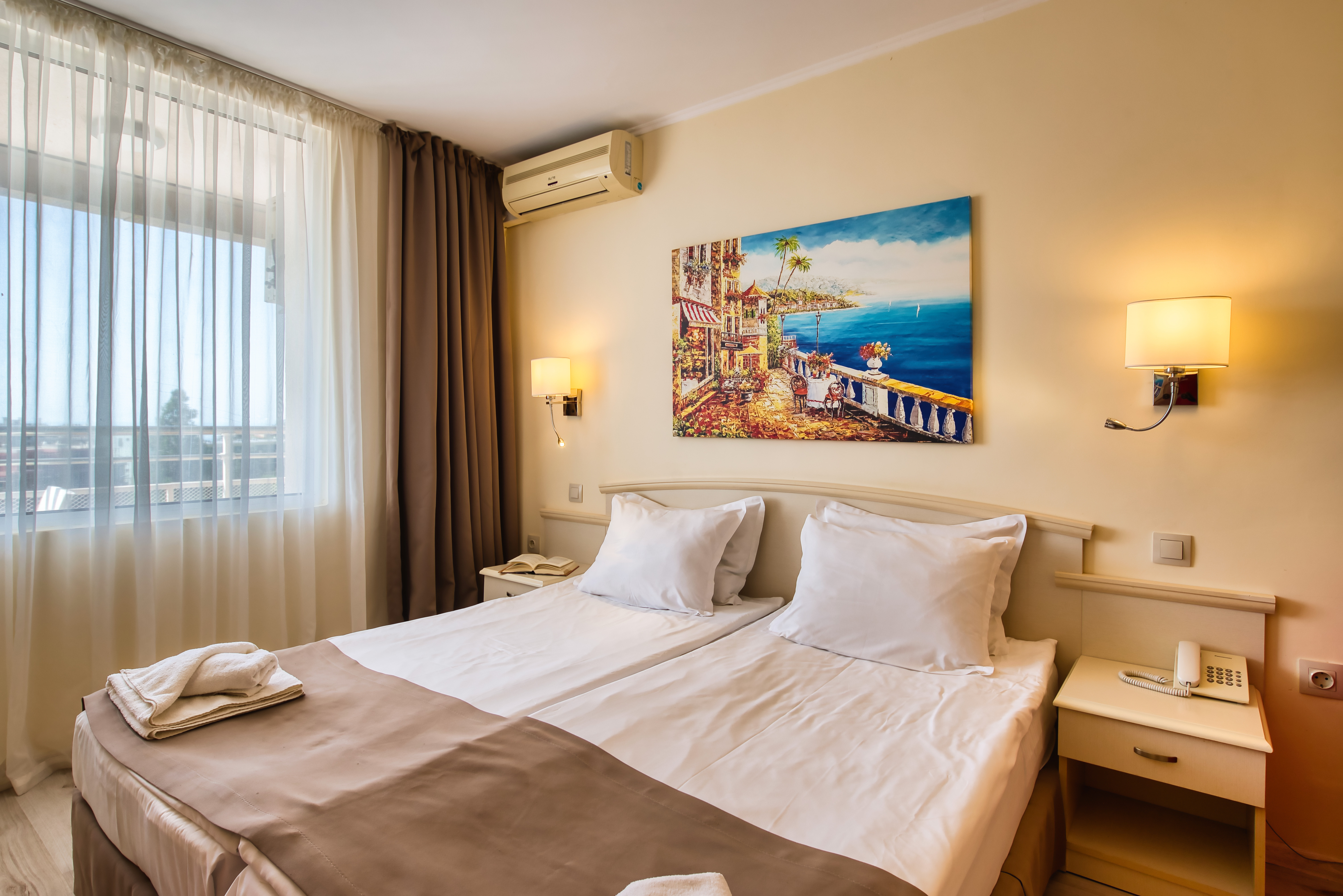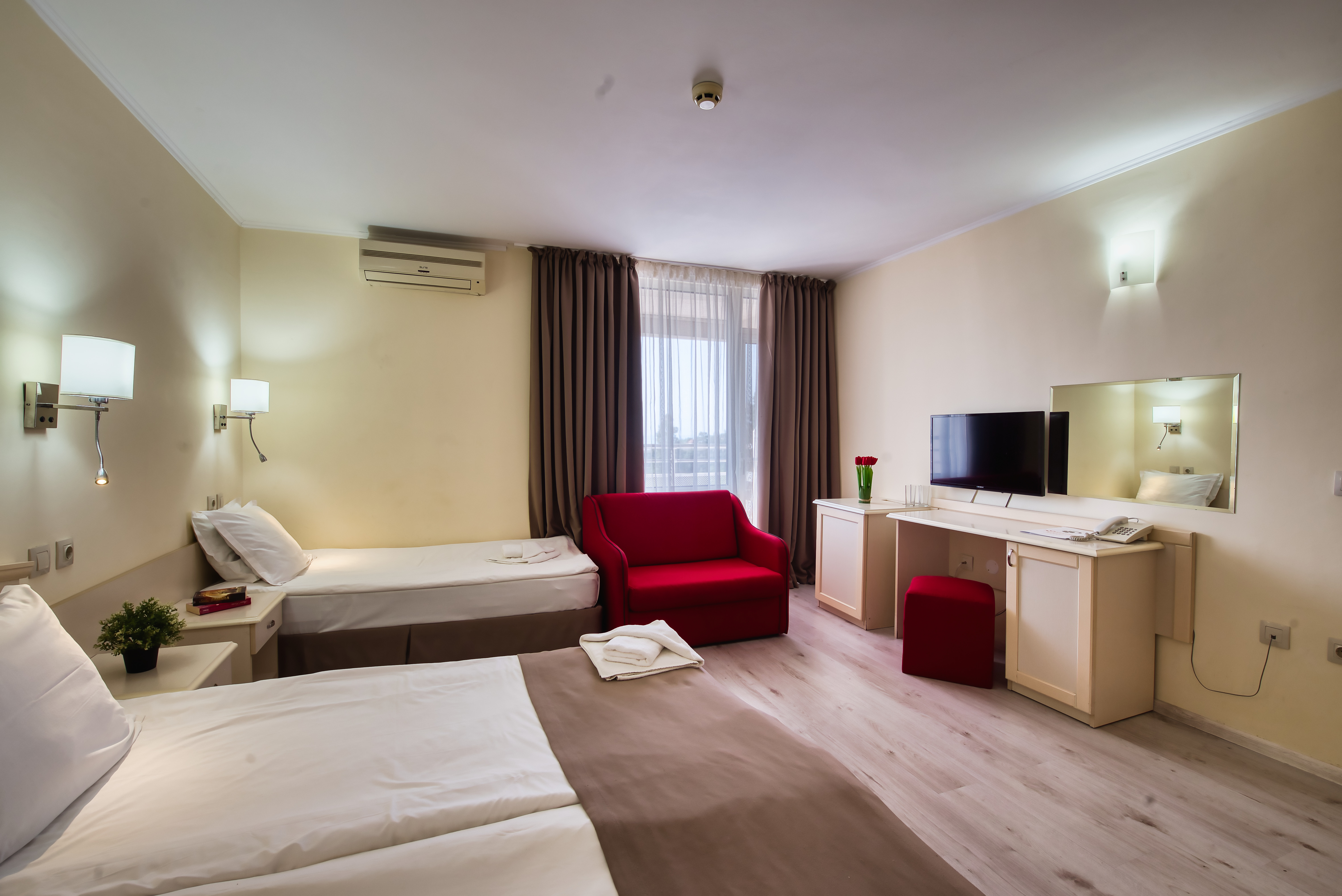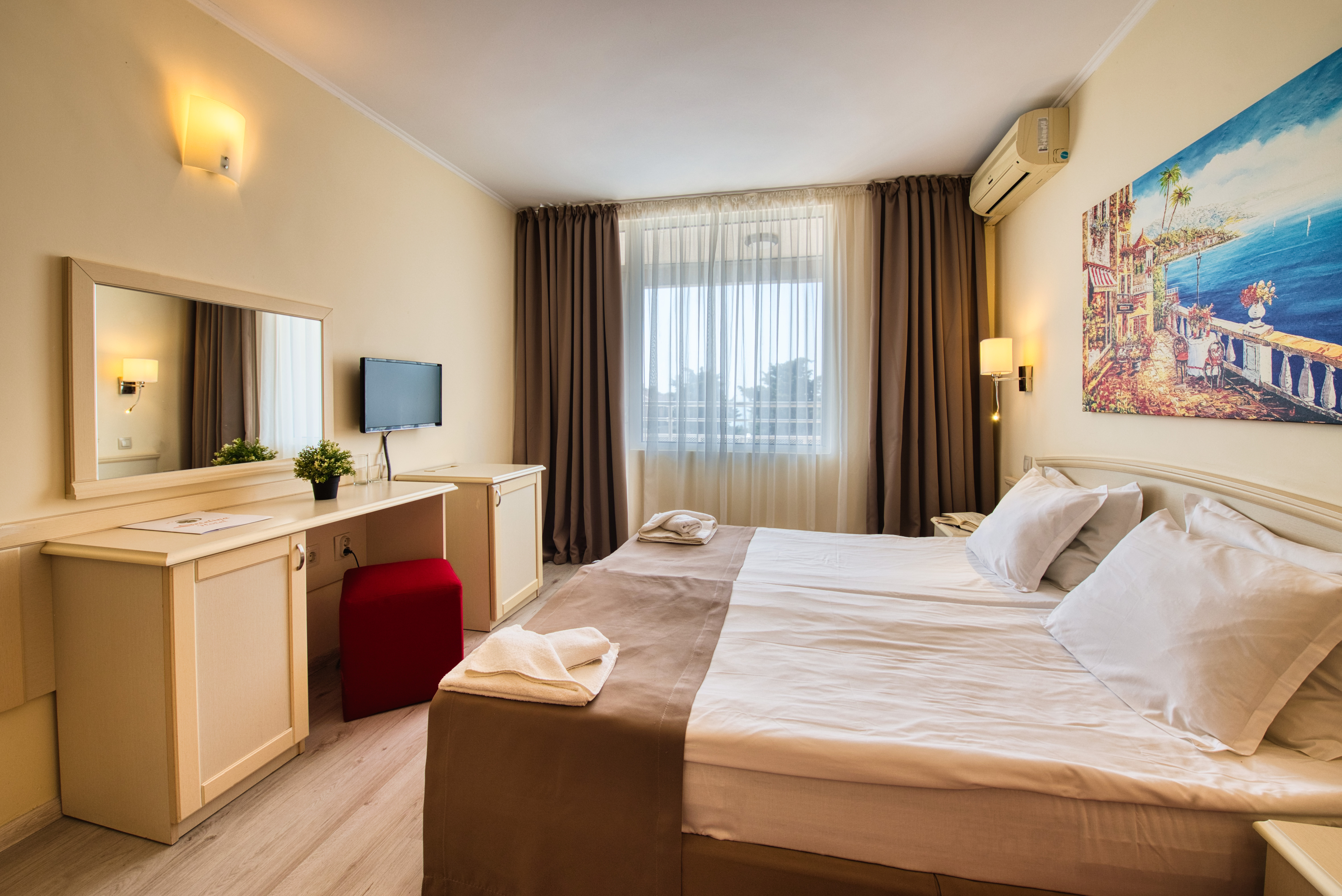 The Detelina is a popular hotel, surrounded by green open spaces and sits enjoying a great location in a quiet area just 300 m from the beach; Golden Sands can be found at around 4 km from the hotel. Guests will be able to find various shopping facilities and entertainment venues within walking distance from the hotel. The comfortable rooms comprise comfortable furnishing and standard amenities. This is a perfect place for budget travellers who wish to spend a few days by the sea.